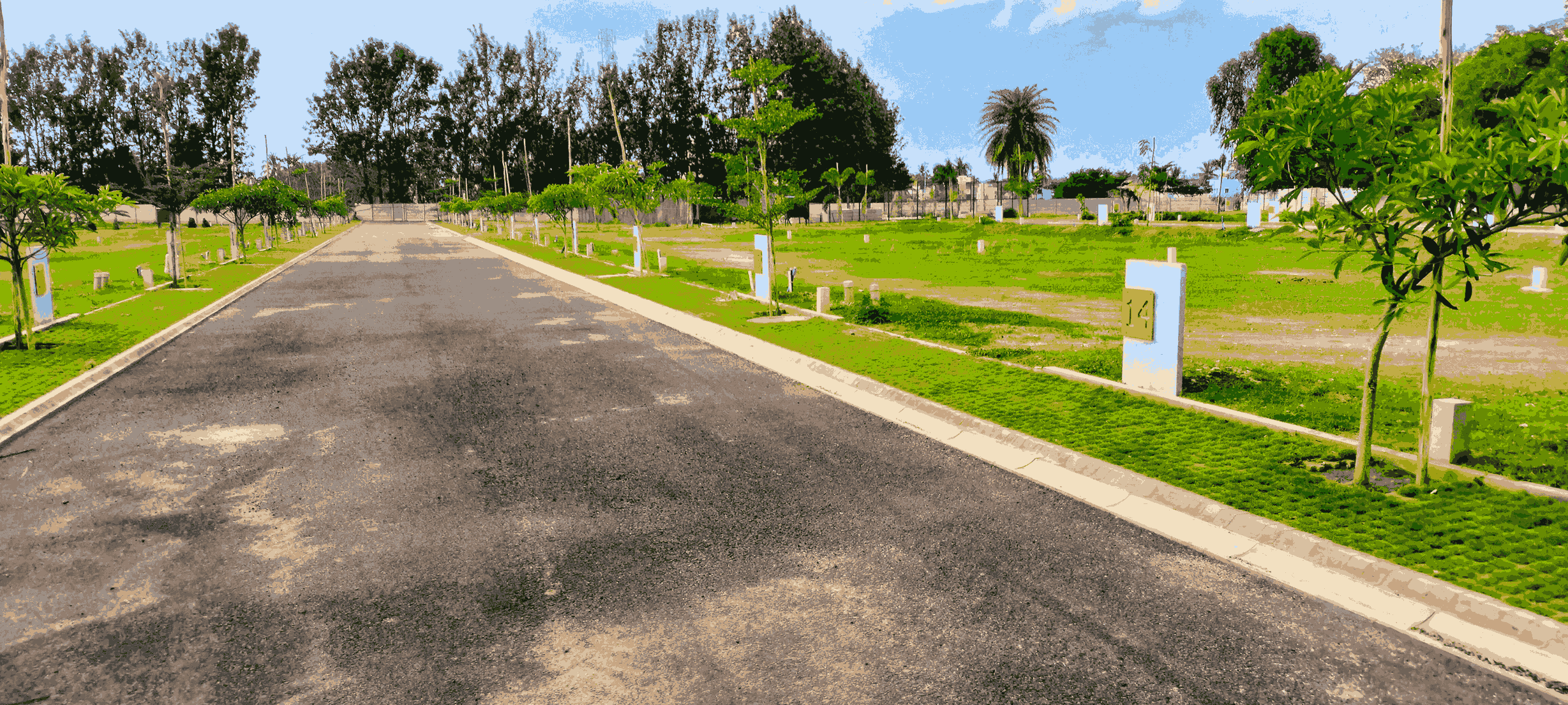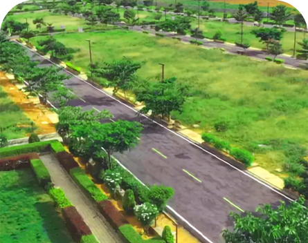 Imposing entrance designed to complement the contemporary style of architecture. 9m wide internal road laid with combination of concrete road with cobble stone design. Grass pavers or solid pavers(as per selection) pedestrian pathways. Landscaped tree plantation on either side of the road.
